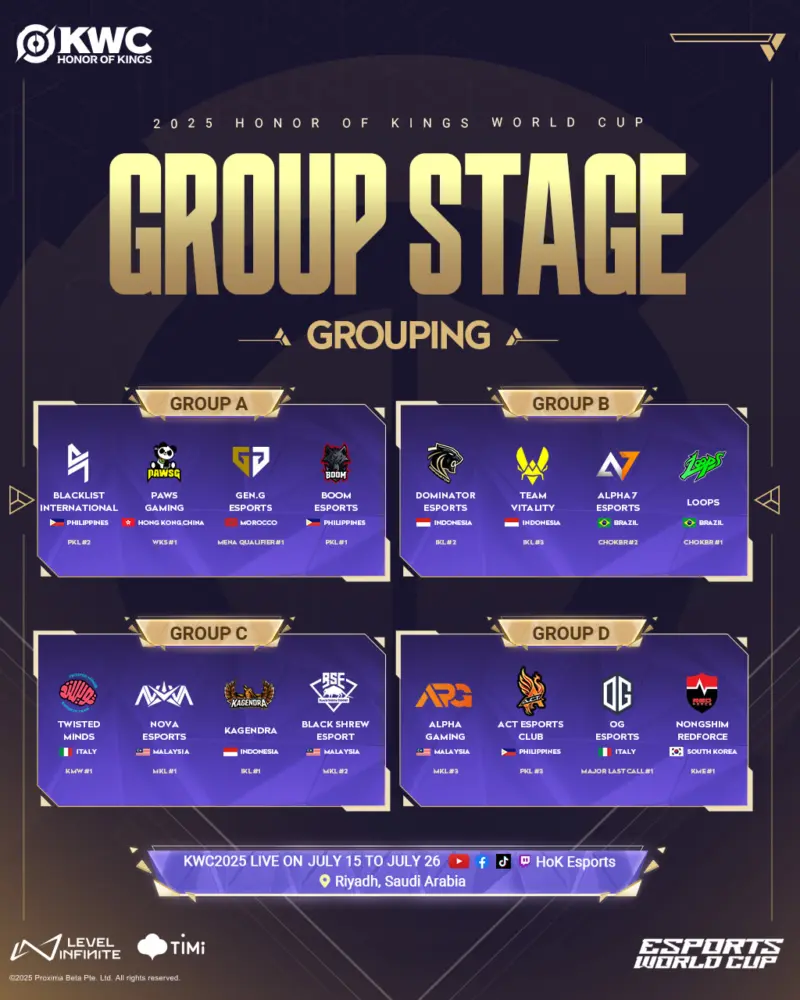 Honor of Kings World Cup (KWC) akan menghadirkan 18 tim terbaik dari berbagai negara yang siap bersaing demi gelar juara dunia. Setelah melalui tahap kualifikasi yang penuh persaingan, masing-masing tim kini telah mengetahui lawan-lawan mereka di babak grup melalui hasil undian resmi.