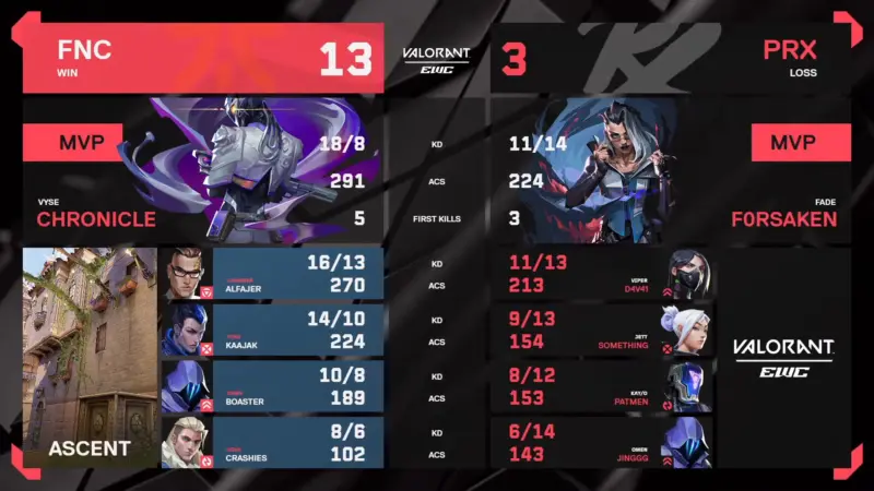 Namun, memasuki map kedua di Ascent, Fnatic menunjukkan taring mereka. Alfajer yang memainkan Chamber tampil luar biasa dengan Operator di tangan. Akurasi aim dan positioning-nya berhasil meruntuhkan formasi PRX, membuat pertandingan berakhir cepat dengan skor dominan 13-3 untuk Fnatic.