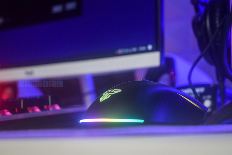 Mouse yang didominasi warna hitam pekat yang sedikit glossy dibalut RGB di bagian sisi belakang mouse dan pada logo Fantech, membuat Penulis cukup terkesan dengan desainnya yang elegan ini.