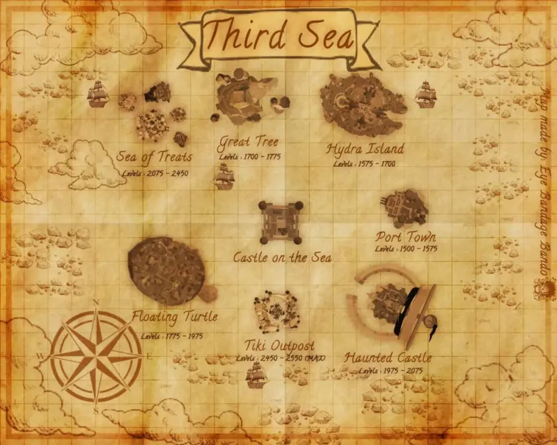 Kalian bakal memulai petualangan di First Sea atau Laut Pertama nih. Ada total 13 pulau yang bisa kalian jelajahi untuk mencapai level 700 sebelum melanjutkan ke Second Sea.